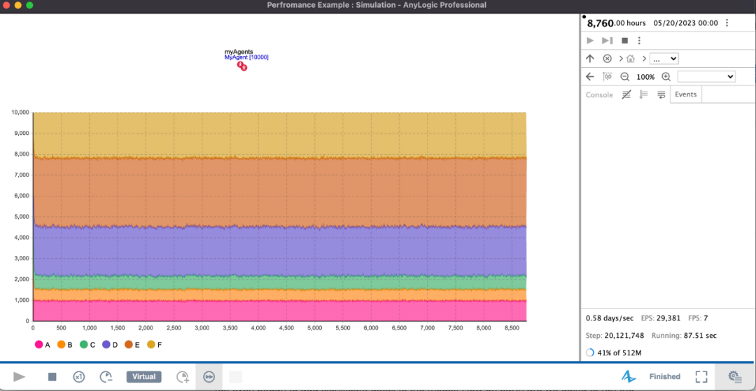 一切看起来都很好!模型仿真了全年,结果看起来合理。内存消耗非常小,小于200 MB。。。但是等等。。。看看执行速度(右下角)。。。超过1分钟来仿真一整年,我们甚至还没有开始为模型添加重要的细节!在我们将智能体的数量增加了一倍,并添加了大量的统计数据、逻辑和功能之后,我们究竟将如何运行该模型。。。。