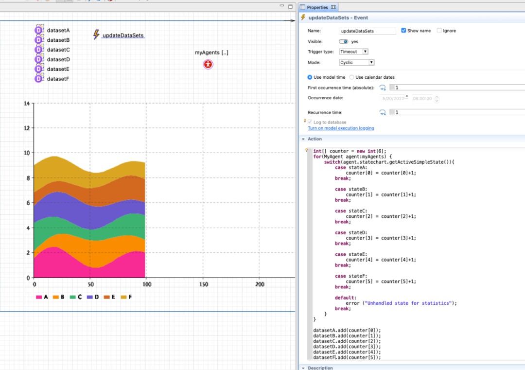 由于findAll()是一个AnyLogic内部函数,我们不能修改。所以我们只需调用该函数一次。与其每次我们想找出谁处于什么状态时都在整个智能体群体中循环,不如让我们循环一次,然后为每个状态统计总数。一旦我们遍历了所有这些数据,我们可以将每个状态的总数添加到数据集,就可以直接在图表使用数据集。
