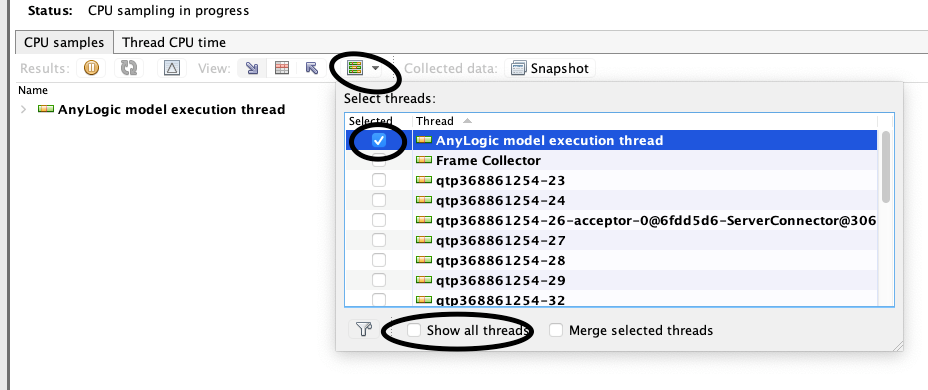 在线程文件器按钮中,取消选择“Show all threads”,并仅选择“AnyLogic Execution Thread”。