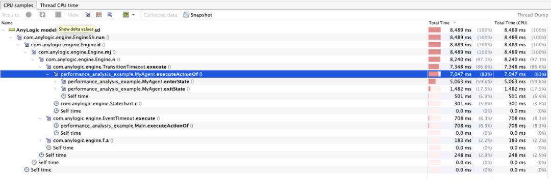 CPU profiler显示方法级CPU性能(执行时间)的详细数据,显示每个方法的总执行时间和调用次数。在分析应用程序性能时,VisualVM对分析应用程序的所有方法进行测试。线程在进入方法时发出“method entry”事件,在退出方法时生成相应的“method exit”事件。这两个事件都包含时间戳。这些数据是实时处理的。