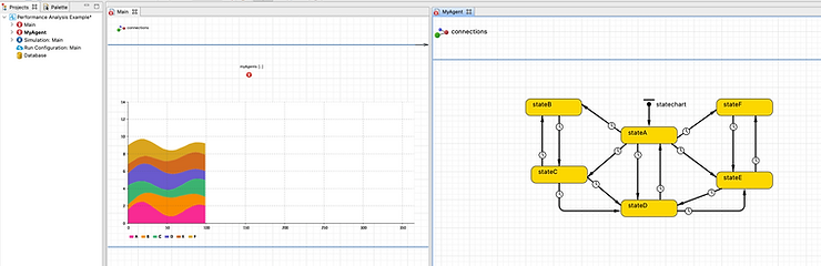 我们有一些智能体,使用了“到时”变迁在6个不同的状态之间移动。这些可以代表rea-life中的不同对象,例如快速消费品公司的订单,其中订单在“等待批准”、“批准”或“拒绝”等状态之间移动。或者,它可以表示供应链中在“运输订单”、“故障”、“加油”等之间移动的卡车。