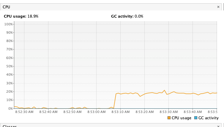 线程:线程图显示了应用程序JVM中活动线程和守护进程线程数量的概述。如果您想在特定时间点捕获和查看应用程序线程上的精确数据,可以使用VisualVM进行线程转储。