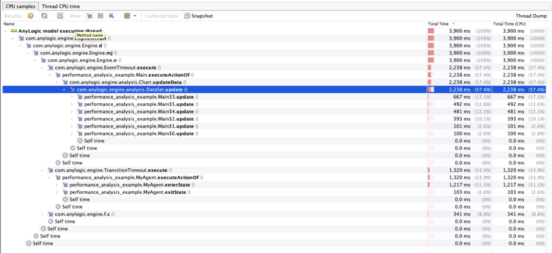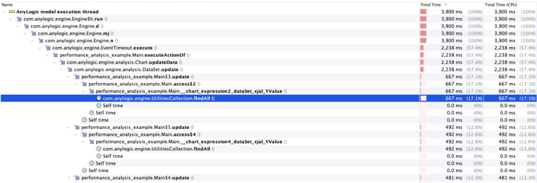 如果我们扩展不同的线程,我们将看到只有两个函数占用了几乎所有的CPU时间“…Chart.updateData()”和“…TrasnsitionTimeOut.execute()”