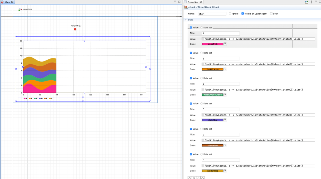 我们要求实习生记录每个州的智能体数量,并将其绘制在叠加时间图上。最近从我们之前的一篇博客文章中了解了lambda函数和非常有用的实用程序函数,他们决定使用findAll()函数,计算每个状态下的智能体数并绘制总数。