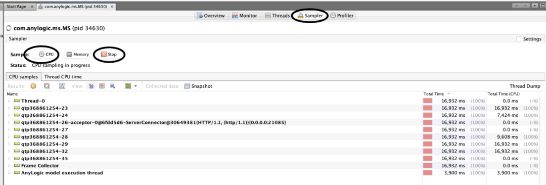 5) 导航到Sampler页面,并在Sample部分选择CPU按钮。等待几秒钟,让分析器记录统计信息,然后点击停止按钮。
