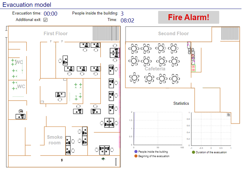 第一层是个可容纳三十人的办公室,由工作台、洗手间和休息区组成,第二层是自助餐厅。两层楼之间只有一个楼梯并且第一层有一个或者两个可用出口。当火警警报响起时,建筑中的所有人会去两个出口中的一个,一部分人可能不会立即反应过来并且继续在工作,有些人可能会恐慌或者吓呆。在跑出建筑前一些人可能会想要回到他们的桌子。火警警报会在指定时间响起或者通过仿真窗口的“火警警报”按钮激活。